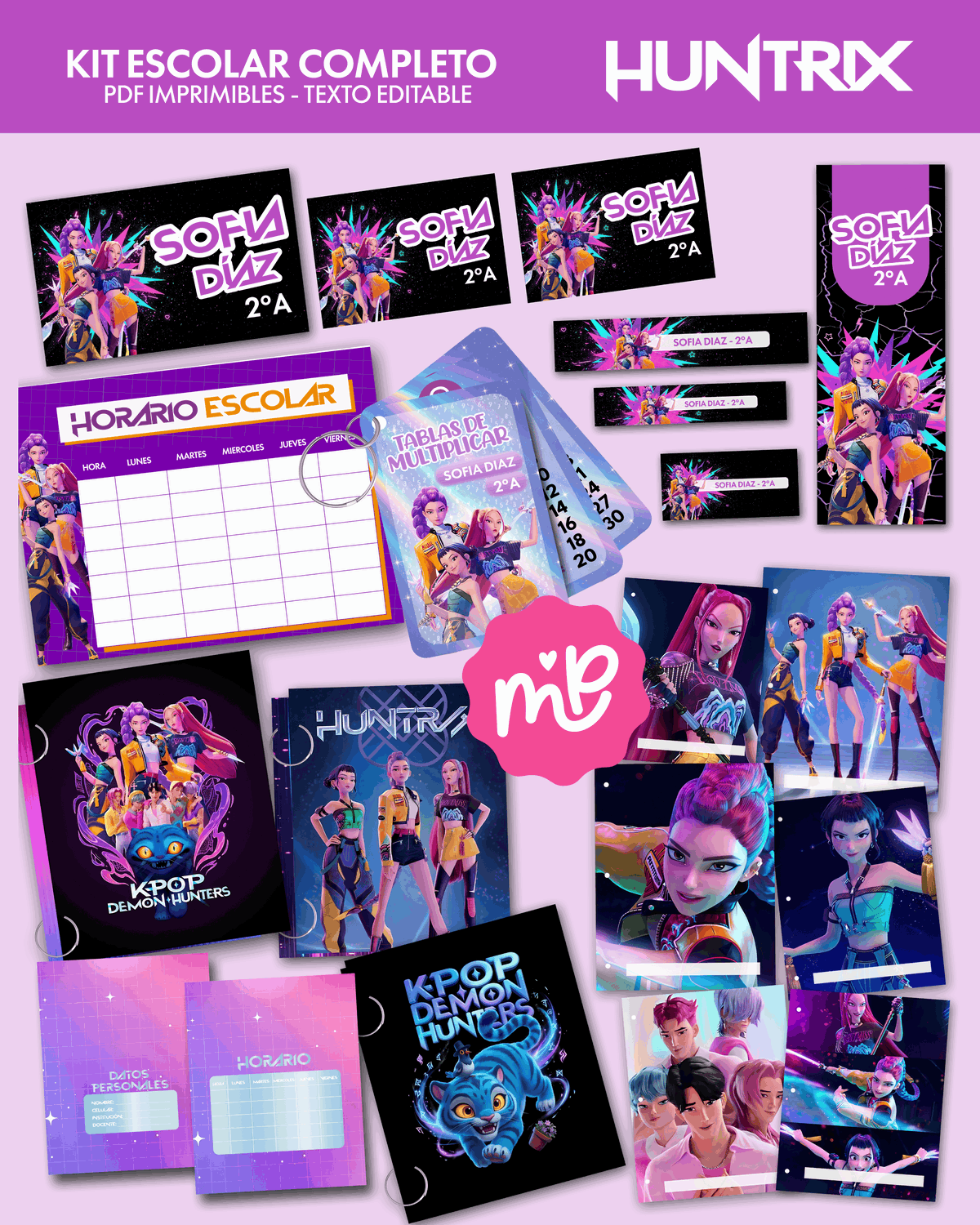 Kit escolar digital temático Huntrix, diseñado con estética profesional y listo para personalizar e imprimir.